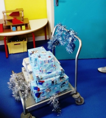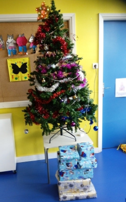 Le père Noël est venu nous faire un petit coucou et nous a apporté des chocolats. Il nous a également apporté une montagne de cadeau que nous avons déposé devant le sapin.