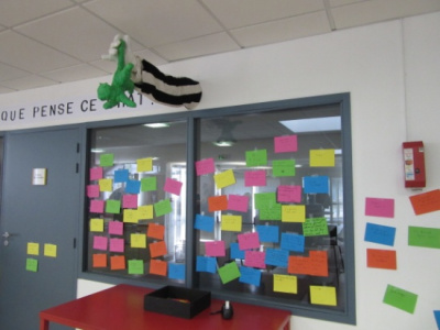 On a imaginé ce que pensait le pauvre petit chat. Cécile a écrit nos propositions sur un papier que l’on a collé sur le mur.